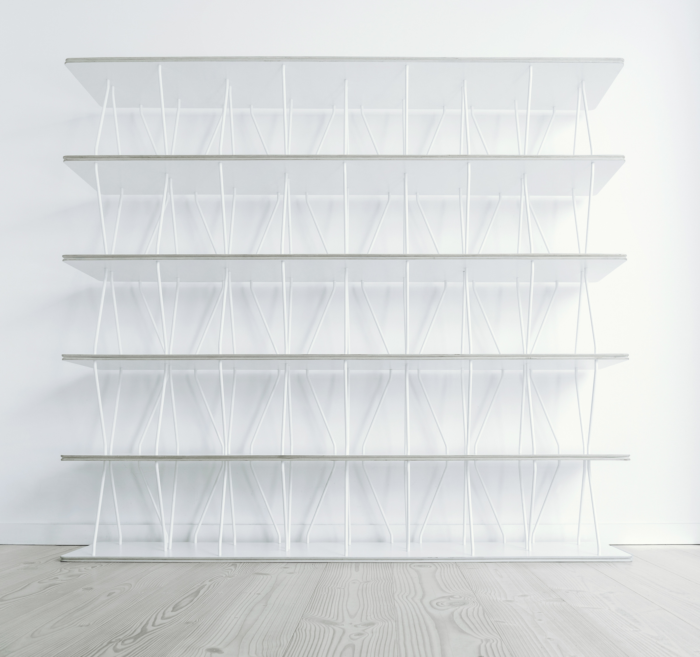 X X-Shelf Eingetragenes Design DPMA Regal für Bücher oder Schallplatten, dessen Tragflächen durch gebogene Metallstangen zu einer komplexen, filigranen Raumstruktur verbunden werden.